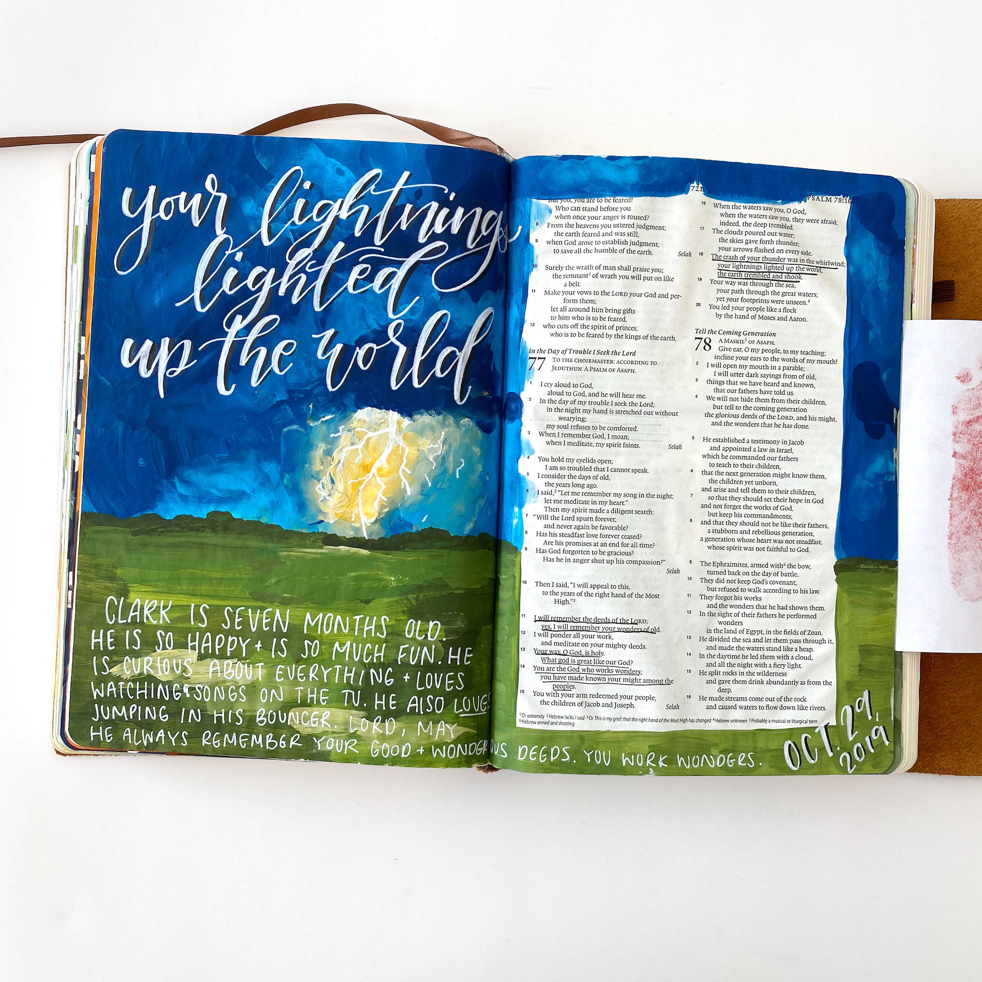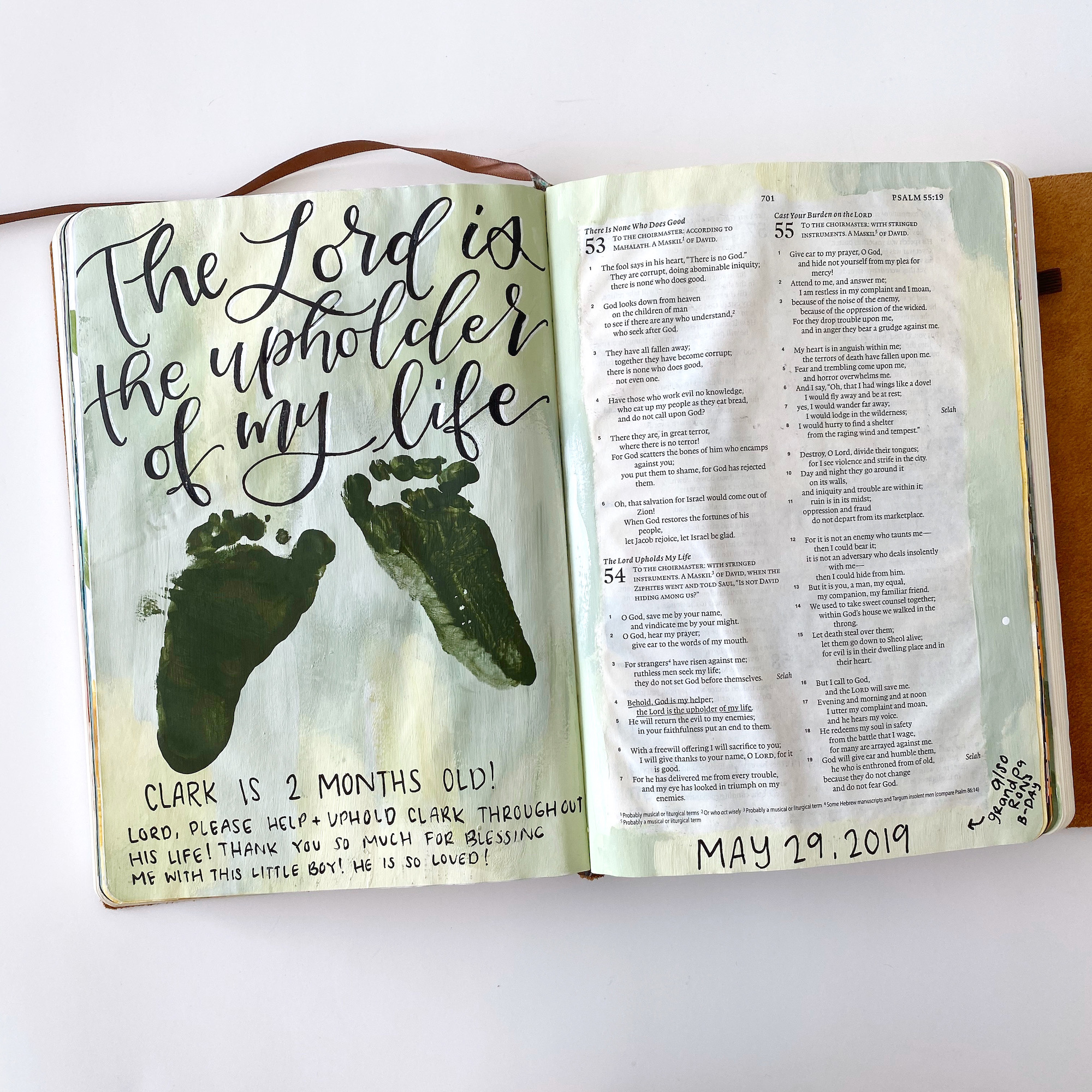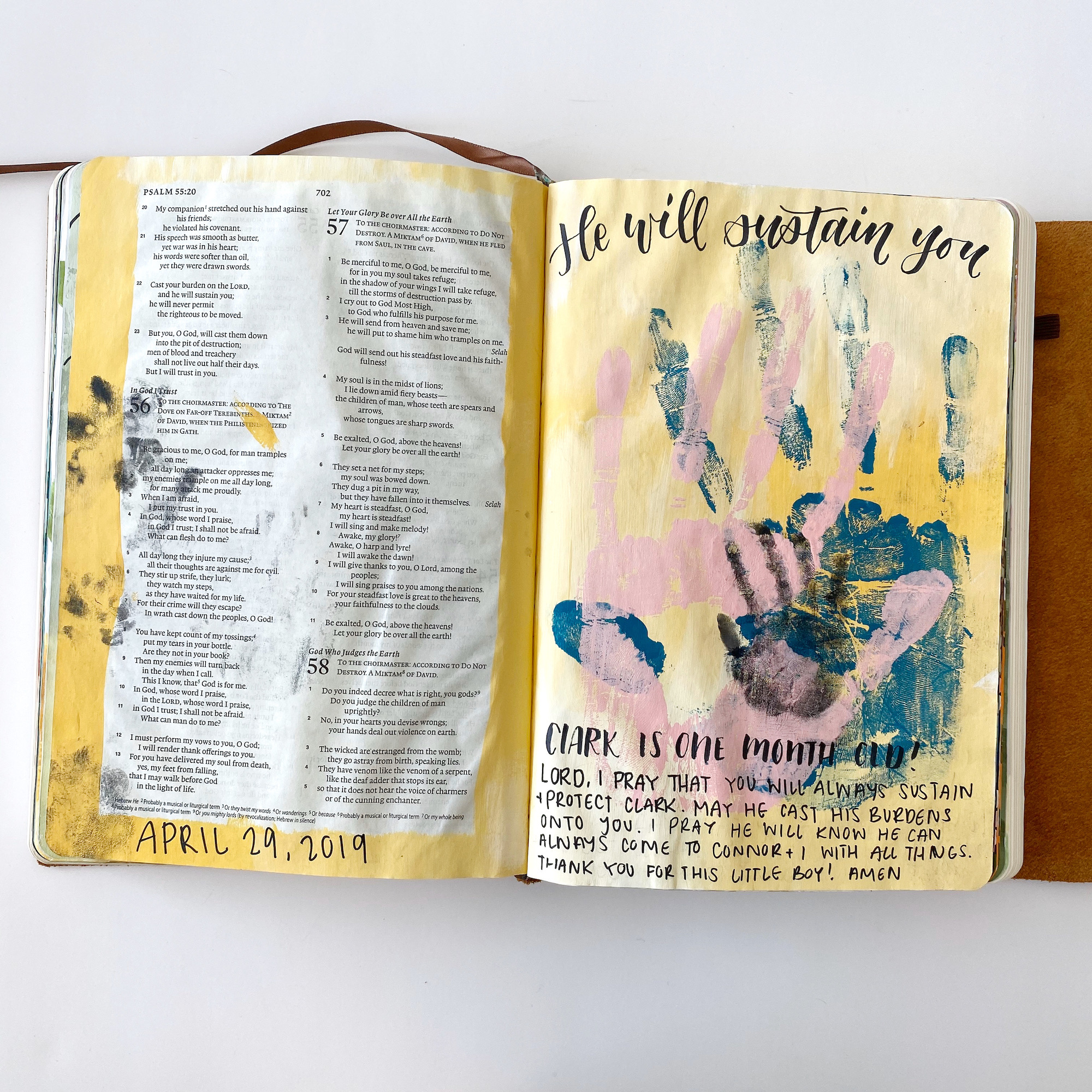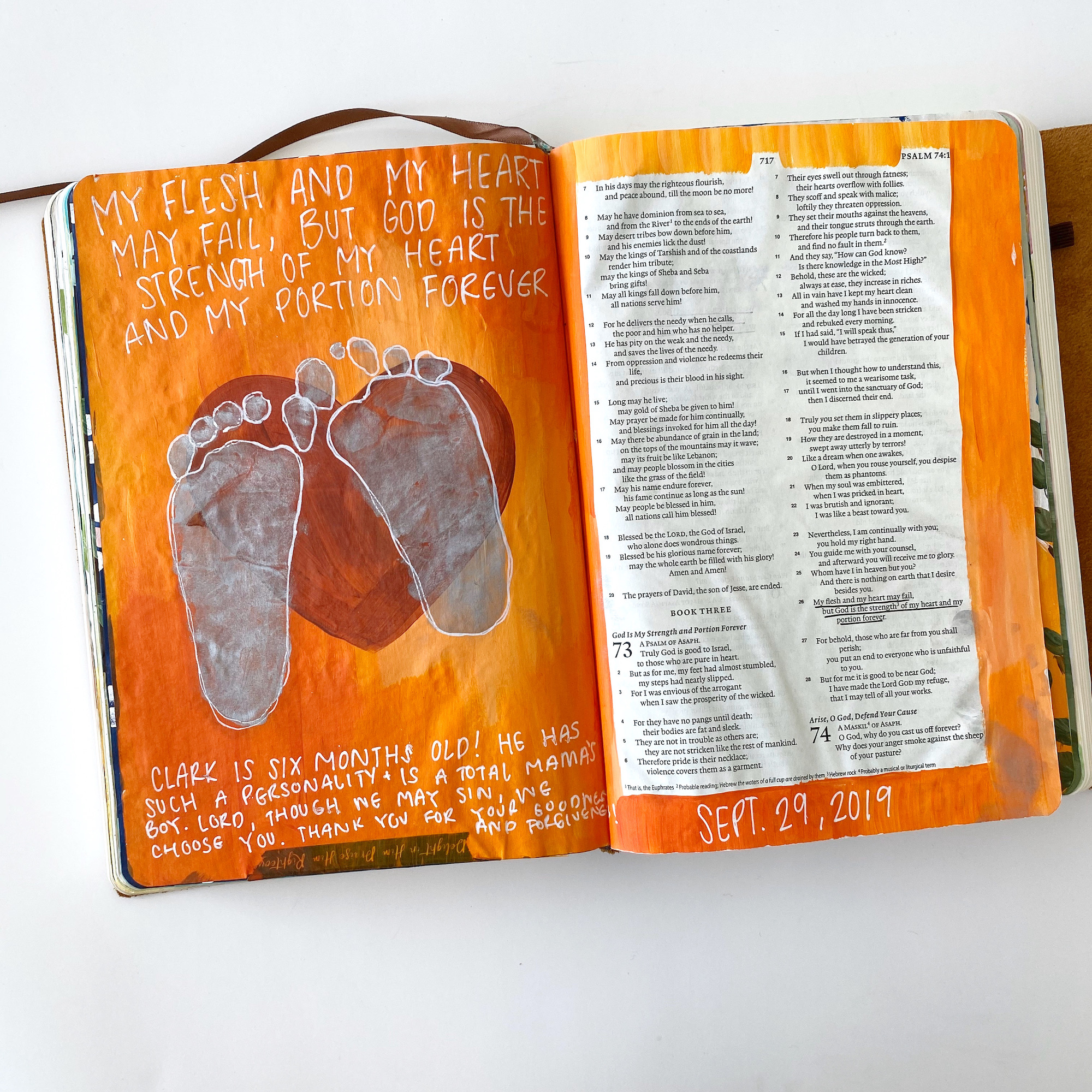 I am also using this Bible a little bit like a baby book; writing down little things like “He’s a Boy!” when we found out his gender, and “Clark is 8 months old! He’s crawling and pulling himself up on everything.” I also have documented his growing footprints and taken his handprint.